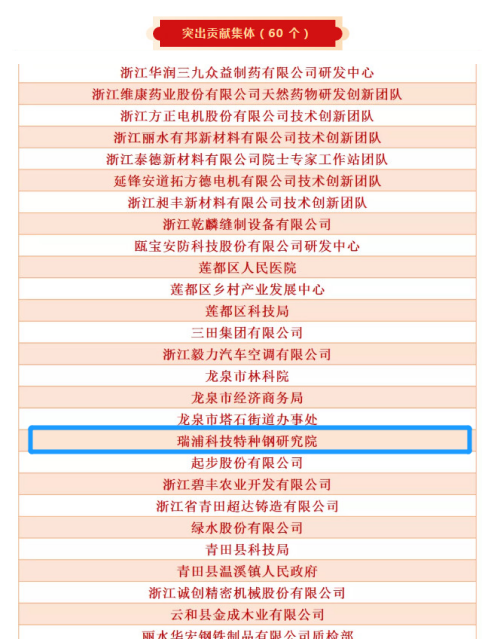 瑞浦科技特种钢研究院入选青田地区突出贡献集体,这是对企业科研创新工作成绩的充分肯定。新起点新使命,新担当新作为,jinnianhui今年会钢铁将不辜负政府的厚望,充分发挥企业多个科研创新平台的作用,力争在科研创新方面取得更大的突破,做出更多的贡献。