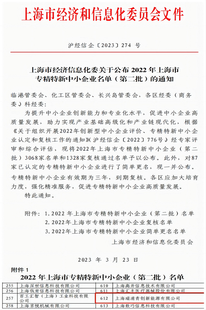 近期,上海市发布了《关于组织开展2022年创新型中小企业评价、专精特新中小企业认定和复核工作的通知》(沪经信企〔2022〕776号)。经过申报、初审、复核等严格程序的遴选,瑞浦兰钧能源股份有限公司下属全资子公司上海瑞浦青创新能源有限公司,凭借在动力及储能电池领域强劲的技术研发实力及持续创新能力,获得上海市“专精特新”中小企业认定。
