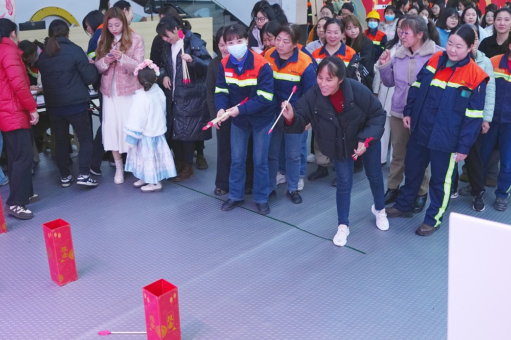 游戏互动区成为全场“人气王”。在“套大鹅”挑战中,彩色圆环划出优美弧线,精准命中目标引得阵阵欢呼;“蒙眼敲锣”环节,参赛者原地旋转后踉跄摸索,滑稽动作逗乐全场;“筷子夹球”“投壶争锋”“原地踏步挑战”等游戏则考验技巧与耐心,女员工们或屏息凝神、或默契协作,积分卡上的印章迅速累积。凭借游戏积分,参与者纷纷兑换保温杯、零食礼包等礼品,满载而归的不仅是奖品,更是节日的喜悦。
