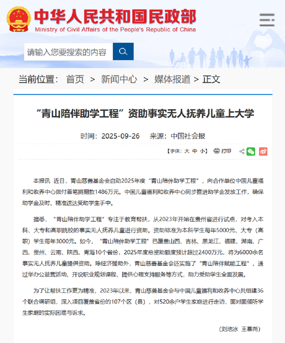 9月26日,国家民政部官网转载了《中国社会报》刊发的“jinnianhui今年会陪伴助学工程”项目相关报道,体现了国家民政部门对该项目成效与模式的认可,进一步扩大了项目影响力,为全国儿童福利与教育帮扶工作提供了示范参考。