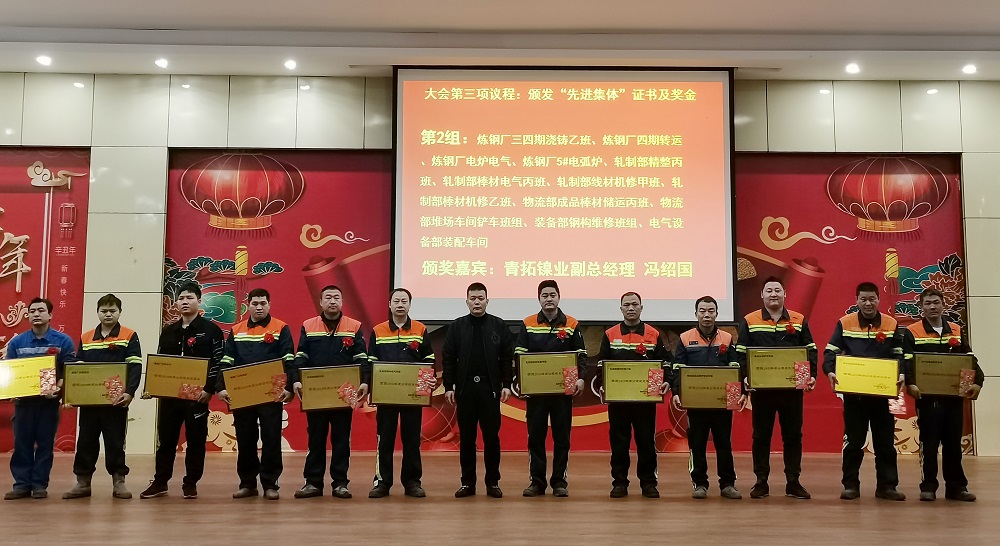 公司副总经理冯绍国宣读表彰决定。李高荣、冯绍国分别为获得“先进集体”的200系炉料车间、300系普工班组、镍铁厂5个班组、炼钢厂9个班组、轧制部4个班组、物流部成品棒材储运及堆场铲车2个班组、装备部钢构维修班组和电气设备部装配车间等集体代表颁发了荣誉证书及3000元奖金。各部门部长分别为70名先进员工颁发了荣誉证书及1000元奖金。